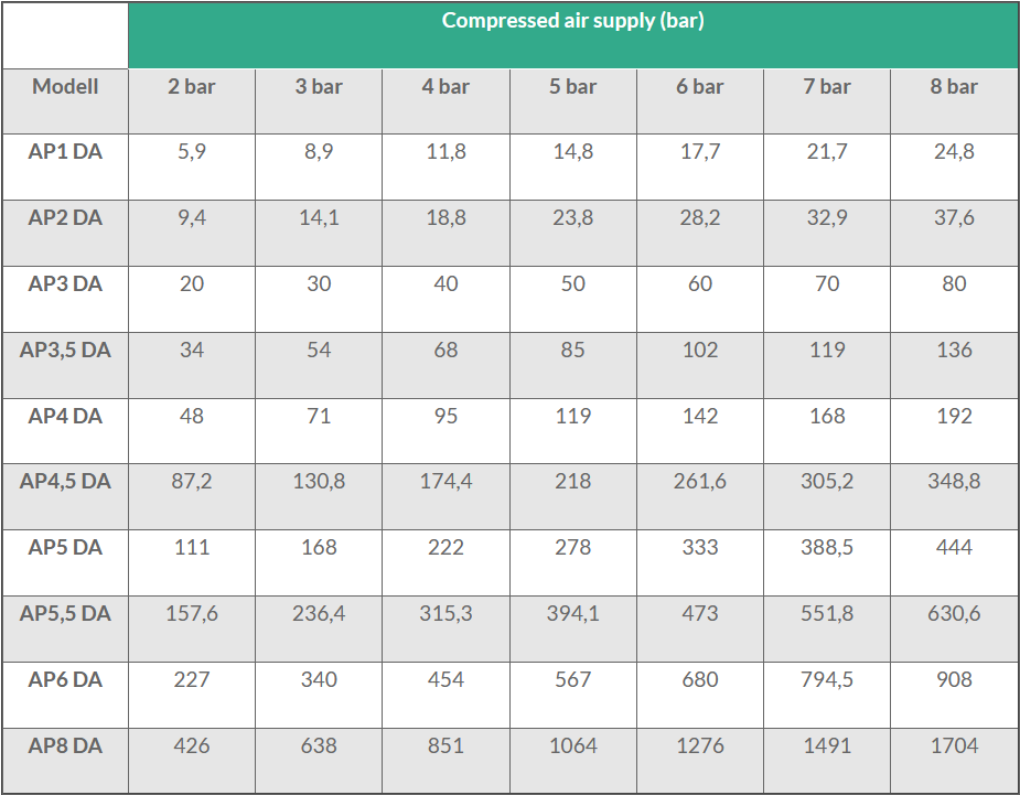 Torques of the double-acting drives AP (Nm)