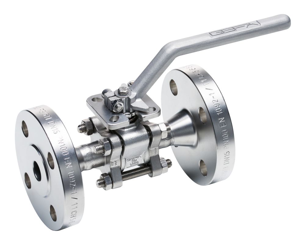 Ball Valve for installation between flanges according to DIN EN 1092 or ASME, 3-piece body, pressure class depending on the nominal size up to PN 125, floating ball, vacuum-tight.