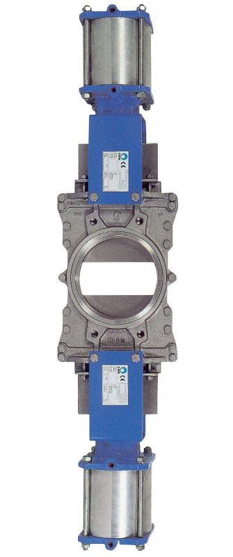 Dirt discharge gate valve with two pneumatic cylinders. Two-piece housing with two slide blades, sealing on both sides.