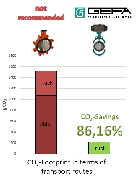- Ship: 18g CO2 per kg product on 1,000km; butterfly valve DN150 8,5kg from Far East; Delivery distance: approx. 7.000km ship + 300km truck from harbor