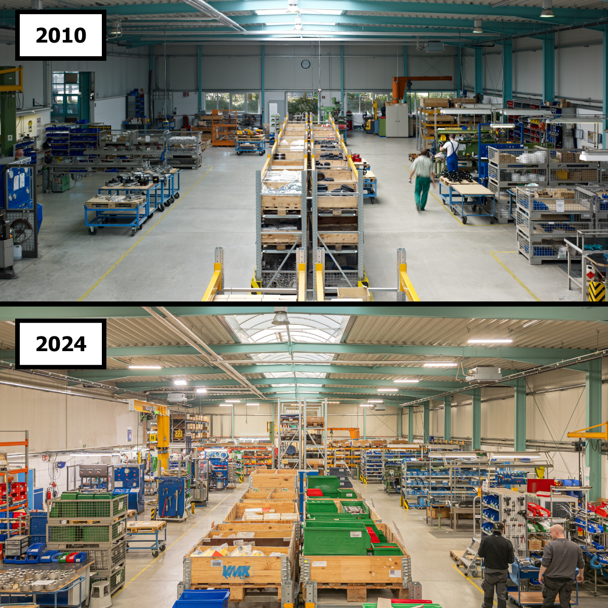 Das obere Bild zeigt die Halle 2 der GEFA Processtechnik aus dem Jahr 2010, die schon damals das Herzstück der Armaturenmontage bildete. Wenn Sie nun einen Blick auf das untere Bild werfen, das 2024 aus derselben Perspektive aufgenommen wurde, erkennen Sie die Evolution, die wir in den letzten 14 Jahren durchlaufen haben.