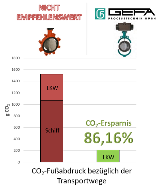 Schiff: 18g CO2 pro kg Produkt auf 1.000km; Klappe DN150 8,5kg aus Fernost; Lieferweg: ca. 7.000km Schiff + 300km LKW ab Hafen