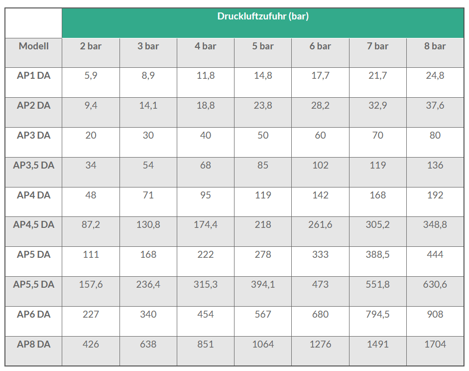 Drehmomente der doppeltwirkenden Antriebe AP (Nm)